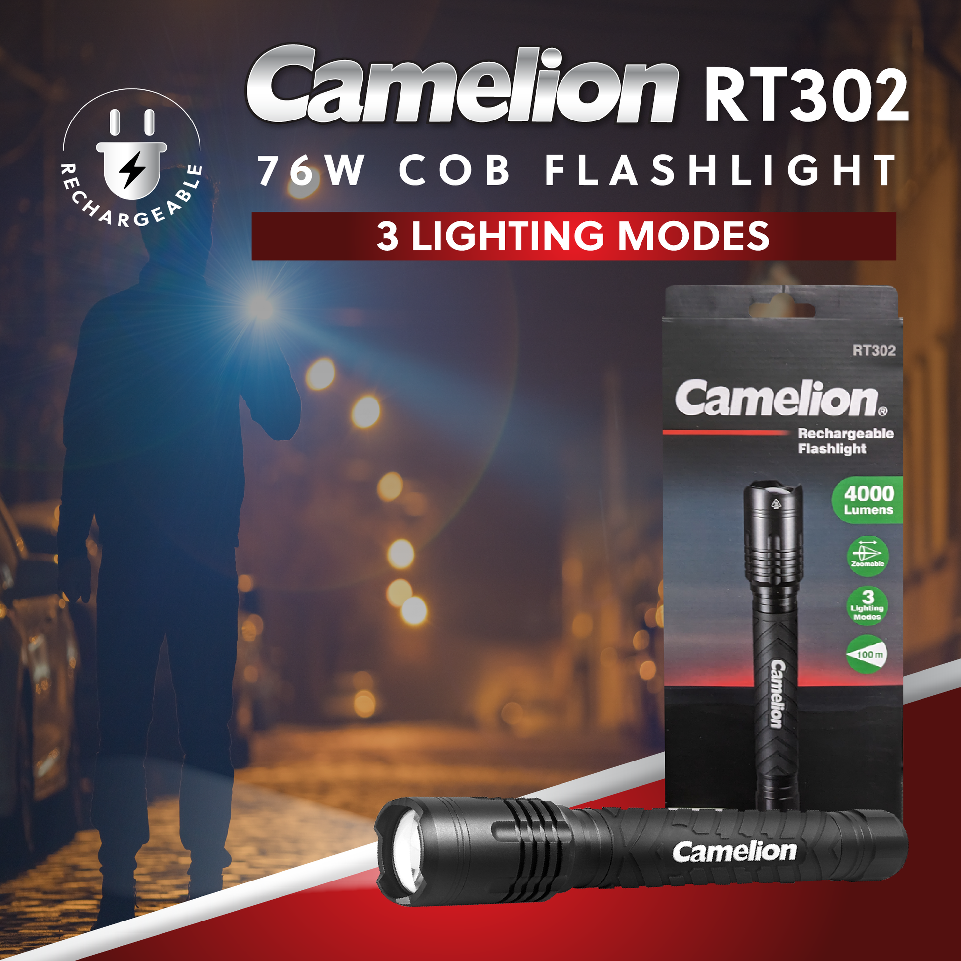 Light up the night with the Camelion RT302, a powerhouse rechargeable flashlight built for professionals, adventurers, and everyday users who demand reliability and performance. Engineered from durable aircraft-grade aluminum, this flashlight delivers up to 4000 lumens of brilliant COB illumination with an adjustable focus beam β making it perfect for camping, hiking, fishing, night patrols, and emergency use.